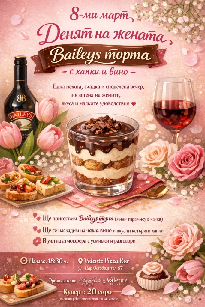08.03/ 18:30 – БЕЙЛИС ТОРТА – СЪБИТИЕ ЗА ДАМИ С КЕТЪРИНГ И ВИНО ВЪВ ВАЛЕНТЕ ПИЦА БАР (ОКРЪЖНА)